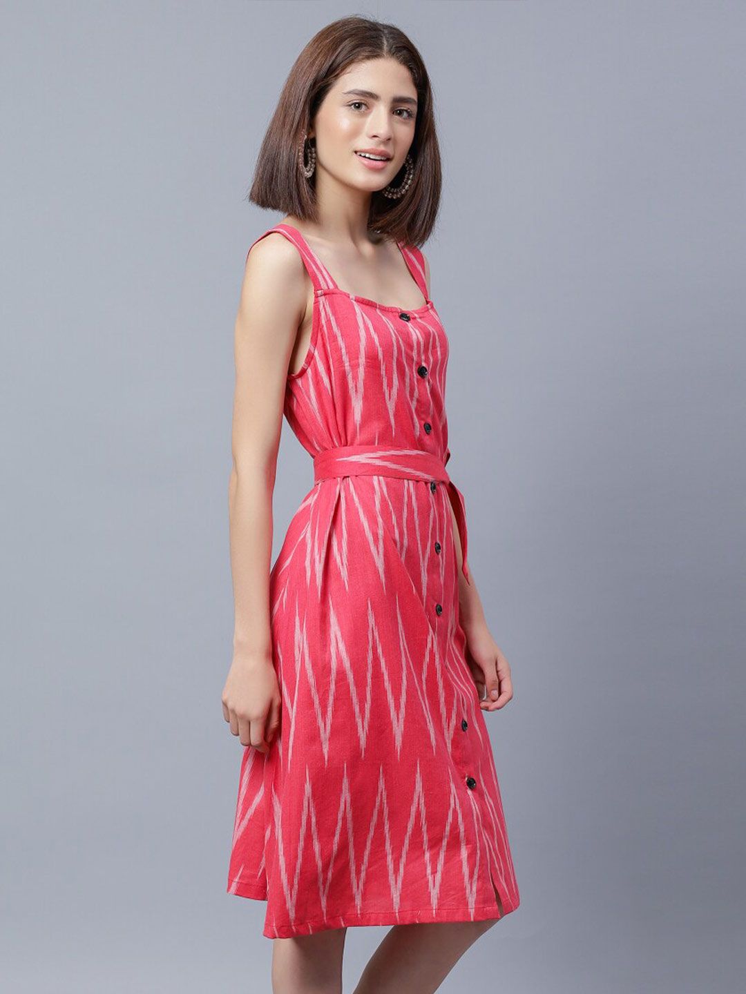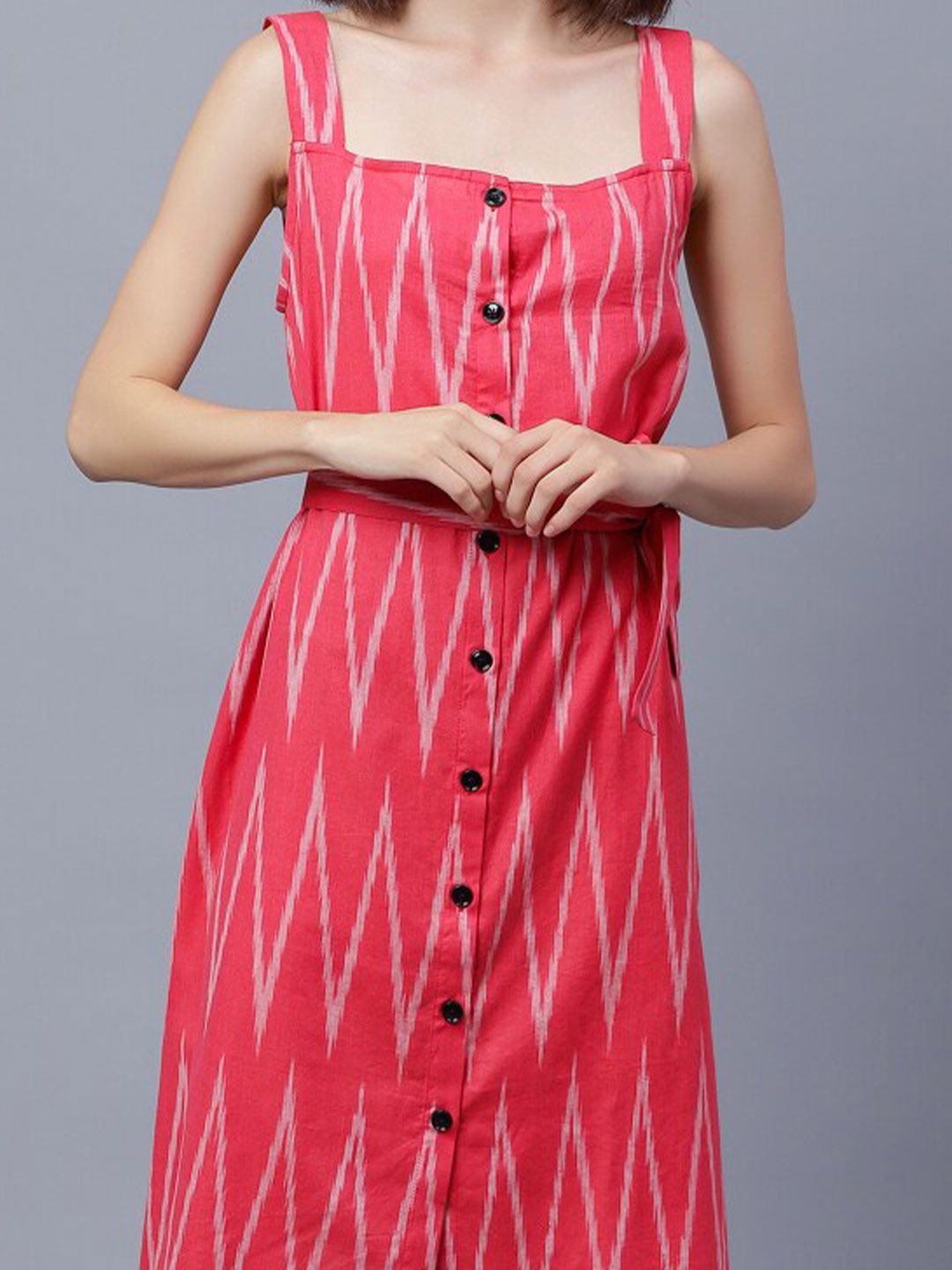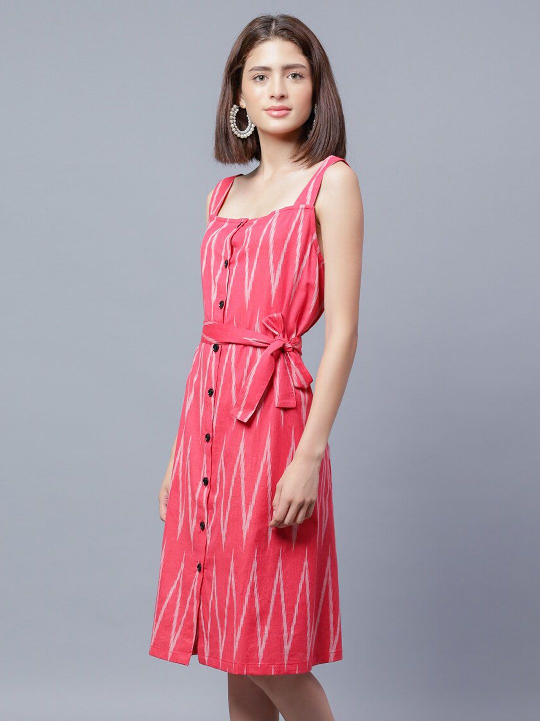 ENTELLUS Chevron Printed Shoulder Strap Belted Cotton A-Line Dress
