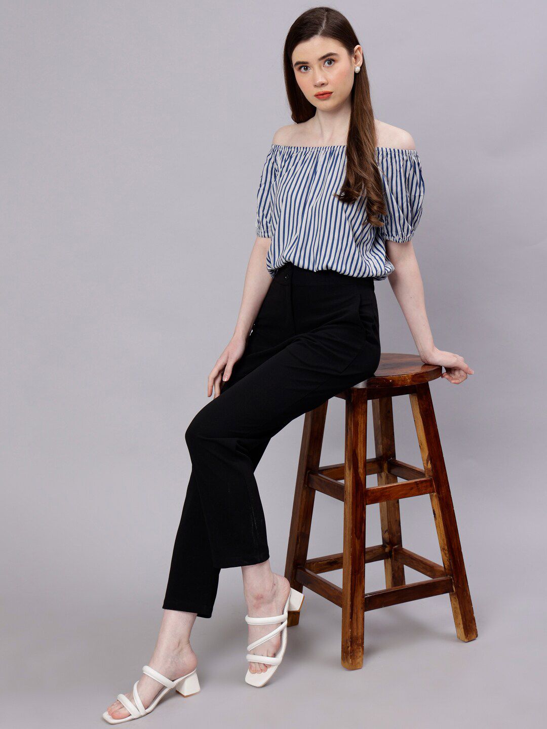 ENTELLUS Striped Off-Shoulder Puff Sleeves Bardot Top